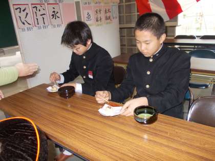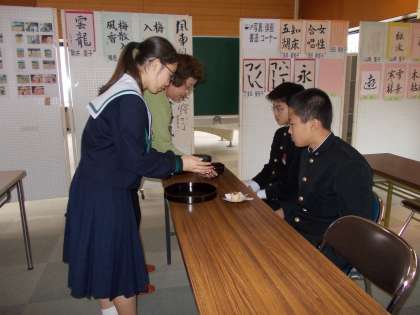12/21市民交流センターにしなりにおいてクリスマス会(お茶会)が開催されました。本年9月サタスタ・特別講座でお世話になった山本ちよ子さんに再びお点前を頂戴いたしました。本校家庭科部もお手伝いし、3年生も受験勉強の合間をぬって参加しました。