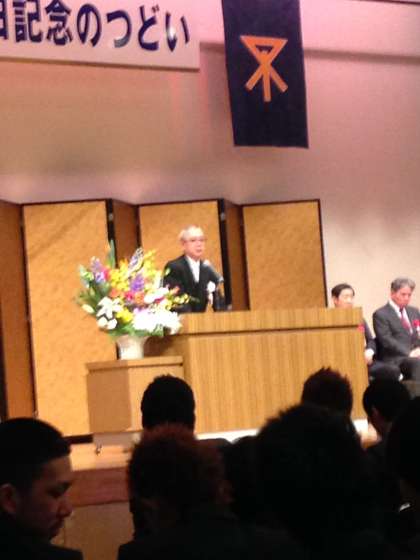 西成区長さんが新成人へのあいさつの中で、本校の『人権防災教育』の取組みを紹介され、昨年の8月に東北視察した折に収録した「被災地の方のお話」を上映されたのです。是非、新成人にも聞いて欲しいということと、西成区の中学生がこんなにも頑張っていることを伝えたいとの思いからされたようです。