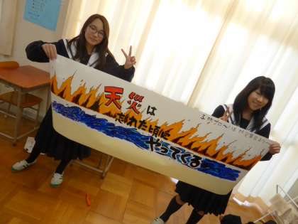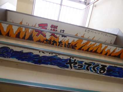 必死に階段掲示の作成に取り組んでくれた2人!!
