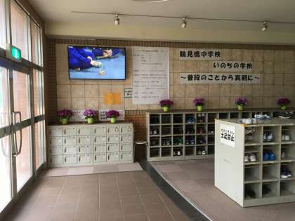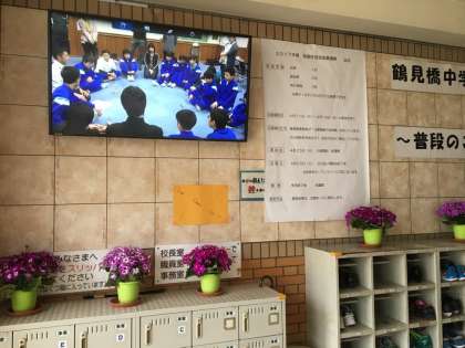 また、正面には大型モニターが設置されており、学校行事の映像などが、登校時に上映されています。