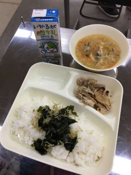 今日の給食は、ごはん、牛乳、豚肉のしょうが焼き、みそ汁、じゃこわかめでした。