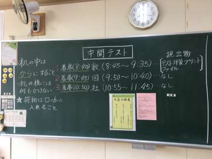 明日は、理科、英語・音楽(2,3年のみ)のテストです。
