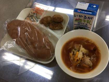 今日の給食は、レーズンパン、牛乳、アーモンドフィッシュ、ミネストローネ、一口トンカツでした。