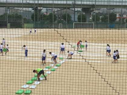 今日は、体育の時間の最初に、運動場のにがりまきを行いました。