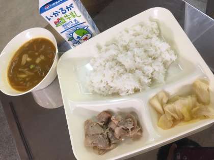 今日の給食は、ごはん、牛乳、カレースープ、鶏肉のガーリック焼き、サワーソテーでした。