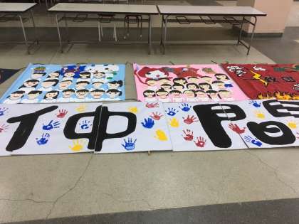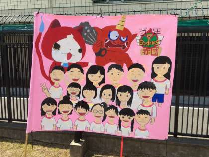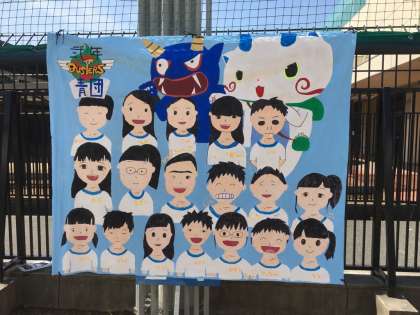1クラス編成の2年生は、学級旗を赤青一対でデザインしました。