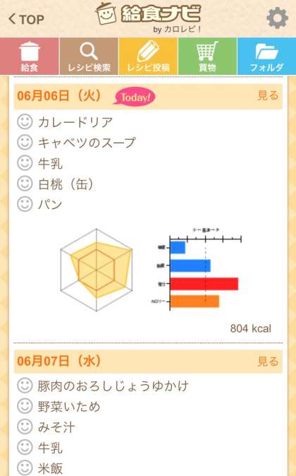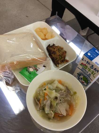 今日の給食は食パン、牛乳、マーガリン、キャベツのスープ、カレードリア、白桃の缶詰でした。