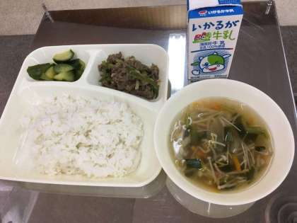 ごはん、牛乳、きゅうりの辛み漬け、ハムと野菜の中華スープ、そしてチンジャオニューロースでした。