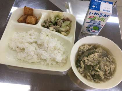 今日の給食は、ごはん、牛乳、かきたま汁、豚肉とやさいのいためもの、あつあげのみそだれかけでした。