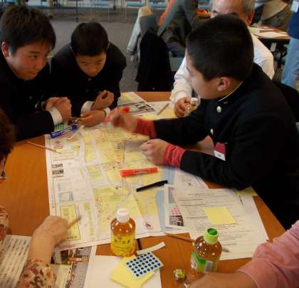 図上訓練は「DIG」ともいい、自分の町で災害が起こったと想定して、避難場所や避難経路、住宅密集地域、消防施設のある場所などを、地図を使いながら行う訓練です。西成区内の人達が、各町内会ごとにグループを作って、話し合いをしました。鶴中のメンバーは長橋地区と北津守地区に分かれて、町内の人達に合流しました。(中図)