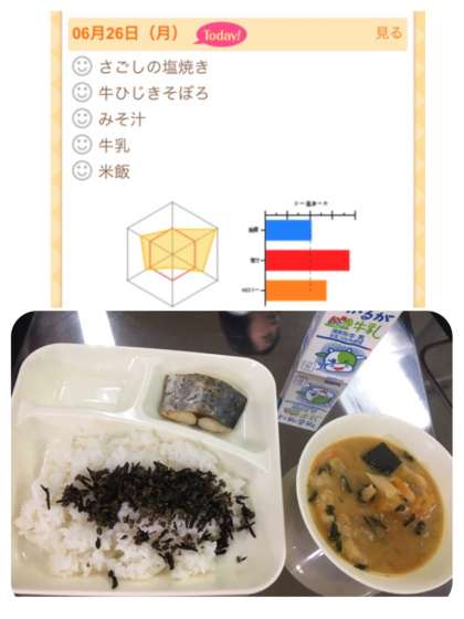 今日の給食は、ごはん、牛乳、さごしの塩焼き、牛ひじきそぼろ、みそ汁でした。