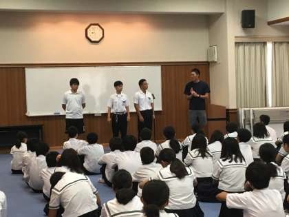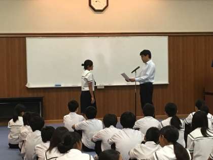 教頭先生の話の後、生活指導の先生のお話や、生徒会長からの話がありました。