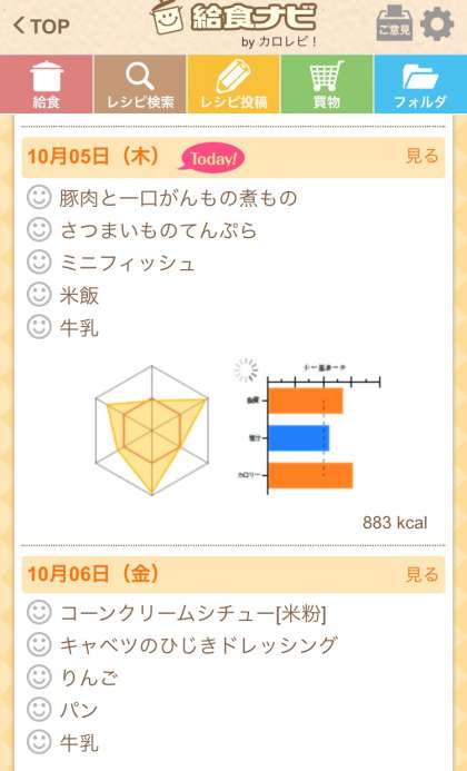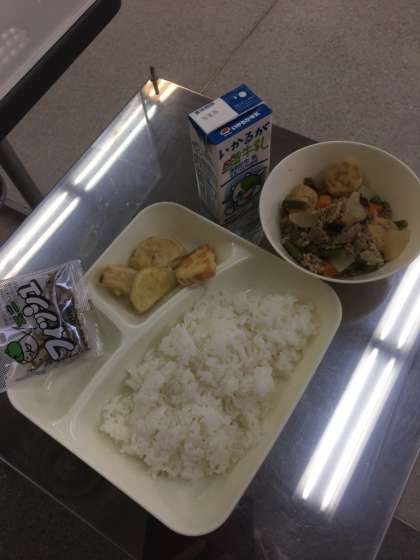 今日の給食は、ごはん、牛乳、ミニフィッシュ、さつまいものてんぷら、豚肉と一口がんもの煮ものでした。