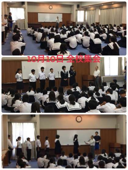 校長先生のお話のあと、後期の生徒会役員、学級役員の認証式を行いました。
