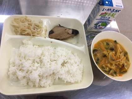 今日の給食は、ごはん、牛乳、もやしのごまあえ、みそ汁、なまりぶしのしょうが煮でした。