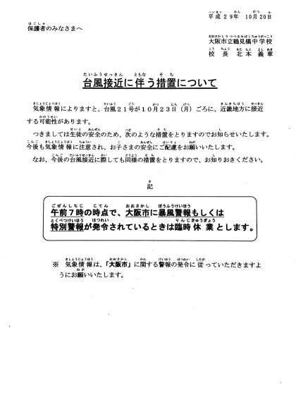 本日、台風接近に伴う措置についてのプリントを配布します。
