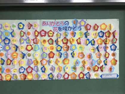 28日のお昼には、北津守小学校の玄関に「ありがとうの花」がいっぱい咲いていました!