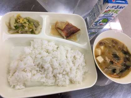 今日の給食は、ごはん、牛乳、なめこのみそ汁、赤魚のしょうゆだれかけ、おおさかしろなのごまあえでした。