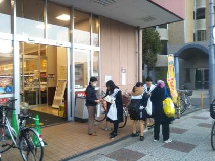 今回は学校近くのスーパーの前で、西成警察や区役所の方々と一緒に防犯のチラシやティッシュを配り、地域の方々に詐欺や自転車盗難への注意を呼びかけました。