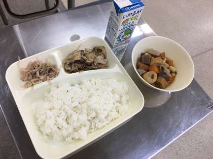 今日の給食は、ごはん、牛乳、豚肉のごまだれ焼き、大豆の煮もの、切り干し大根のしそ甘酢づけでした。