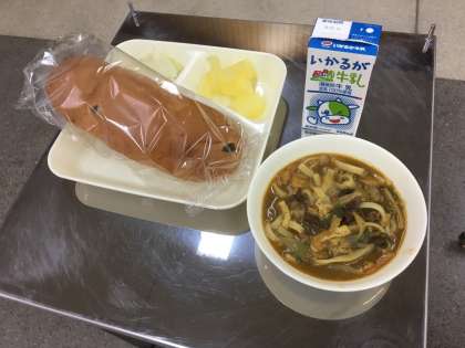 今日の給食は、レーズンパン、牛乳、りんごの缶詰、カレーうどん、はくさいの甘酢あえでした。