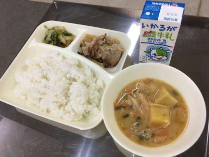 ごはん、牛乳、さつまいものみそ汁、豚肉のしょうが焼き、きくなとはくさいのごまあえでした。