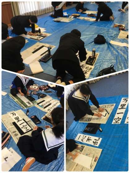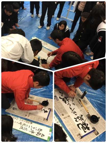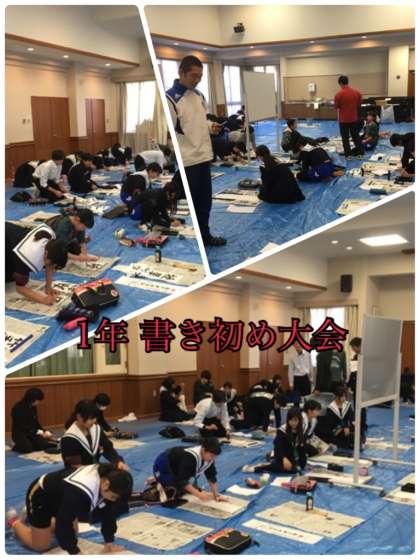 学年みんなで多目的室に集まり、一斉に今年の目標を書きました。