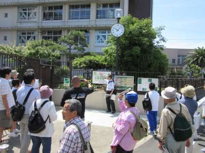 まち歩きでは、地域の地盤・地形の特性(低地・防潮堤・浅い地下水位)や街並み(長屋・木造家屋の密集状況)、広域避難所・災害時避難所の位置やサイン、井戸などを見学・確認しました。