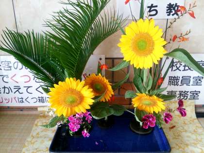 玄関には、『鶴の恩返し』にちなんで、ひまわりとソテツを使って『鶴』をイメージしてご近所の方が生けてくださいました。多目的室も朝からバルーンアートで飾り付けられ、あとは本番を待つばかりです。ぜひ、お越しください。