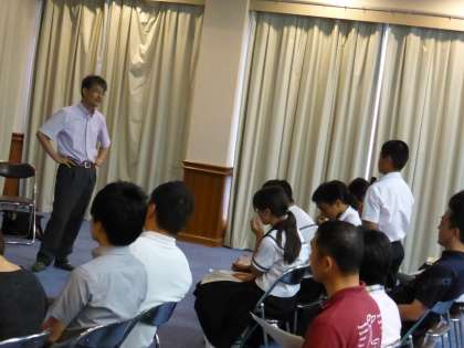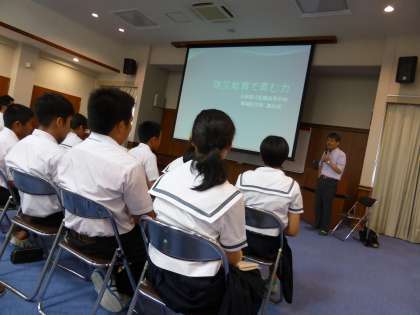 今回その一環として、本校の校内研修に兵庫県立松陽高校教諭の諏訪清二先生に講師としてお越しいただきました。諏訪先生は全国で唯一の環境防災科のある兵庫県立舞子高校で12年間担当科長を努め、子どもたちとともに様々な取組をはじめ、東日本大震災の被災地や中国・ネパールなどに子どもたちとともにボランティア活動を行うなど、先進的な取組をされています。