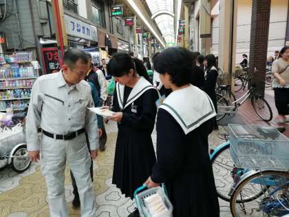 29日(月)鶴見橋商店街の越前屋さんの前で、恒例となった西成警察署、区役所の方々との防犯チラシ配布のボランティアを行いました。