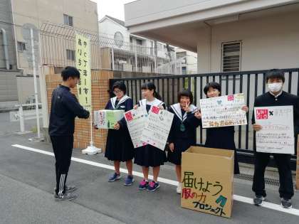 世界の笑顔のために「何か行動しよう」とスタートしたばかりの後期生徒会が中心となり準備をしてくれました。※写真は明日からの回収開始に向けて「あいさつ運動」をしながら呼びかけている様子です。