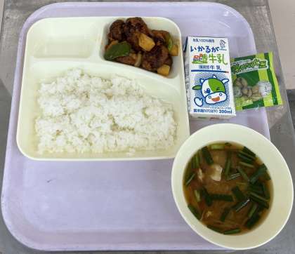 給食の酢豚は、たまねぎ、たけのこ、にんじん、ピーマンをいため、ケチャップなどで味付けをした甘酢あんと豚肉を絡ませています。
