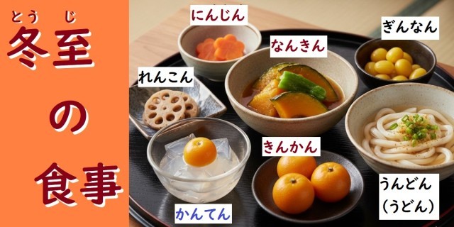 日本では昔から、「ん」がつく食べ物を冬至に食べると、運がよくなるといわれています。また、「ん」が二つ入るとさらに良いとされ、その一つがかぼちゃ(なんきん)です。かぼちゃは、冬まで保存することができ、ビタミン類を豊富に含んでいます。そのため、かぼちゃを食べることで、寒い冬を元気に乗り切ろうという昔の人の知恵でもあります。