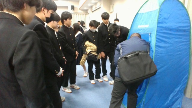 生徒会からの発表の後は、各学年3か所に分かれて防災に関する体験学習をしました。