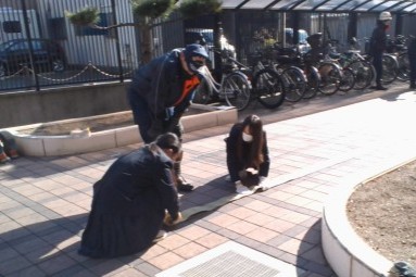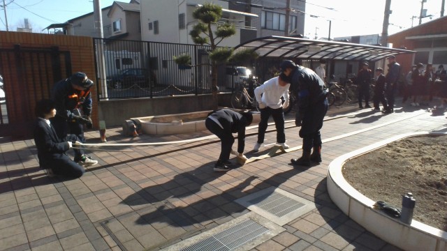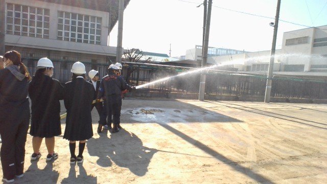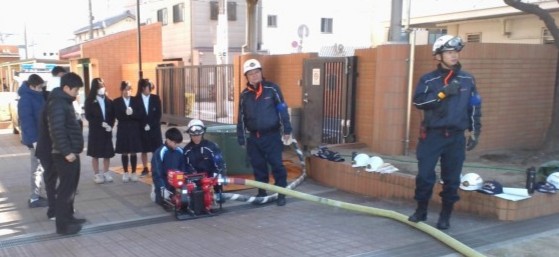 消防ホースの巻き方、放水訓練を体験している様子です。