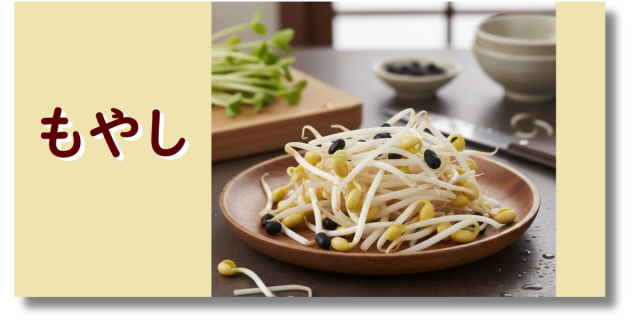もやしは、ブラックマッペや緑豆、大豆などの種子を発芽させたものです。