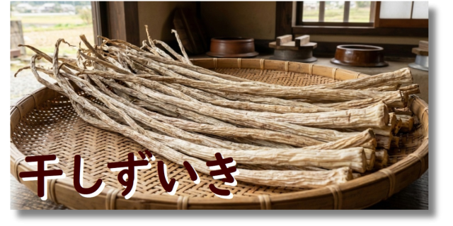 さといもの葉と茎をつなぐ部分を「ずいき」と呼びます。干しずいきは、ずいきの皮をむいて、水にさらした後、乾燥させたものです。食物繊維やカルシウム、鉄を多く含んでいます。
