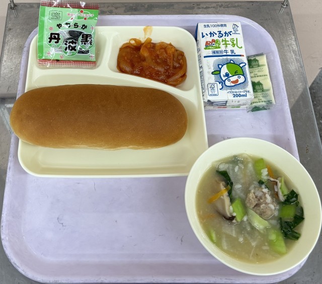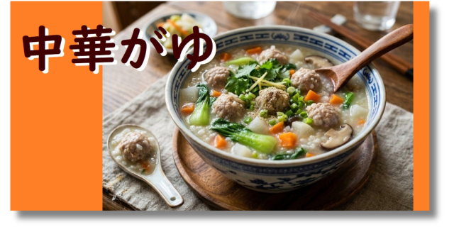 米を多めの水でやわらかく煮た料理を「かゆ」といいます。中華がゆは、味付けをしたスープで米を煮て作ります。給食の中華がゆには、米のほかに肉だんご、チンゲンサイ、だいこん、にんじん、しいたけが入っています。チキンブイヨン、しょうゆ、塩で味付けし、ごま油で風味を付けています。