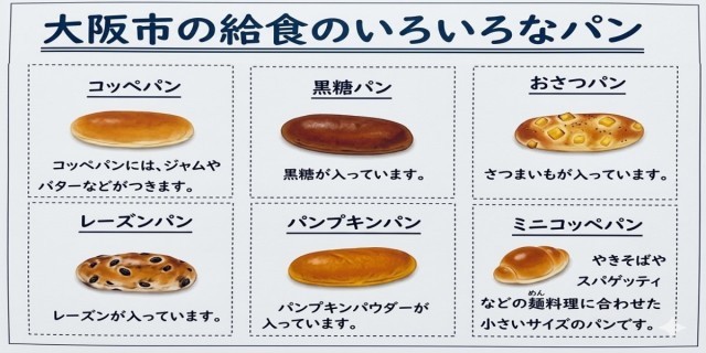 大阪市の給食のパンは、小麦粉、砂糖、ショートニング、脱脂粉乳、イースト、食塩などを混ぜ合わせて作ります。