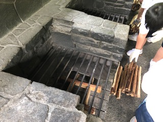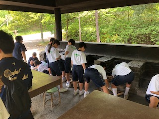 用具、食器、食材、マキ、シバを取りに行き、取ってきたマキを組んでカマドに火をつける準備をしています。