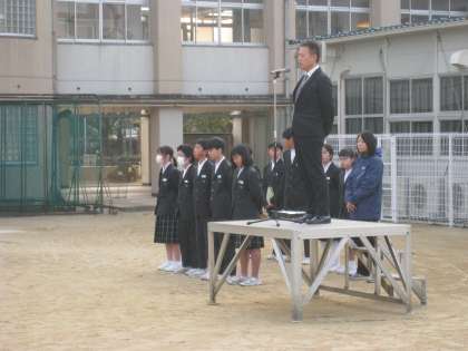 先生3人で全校生徒を見ながら