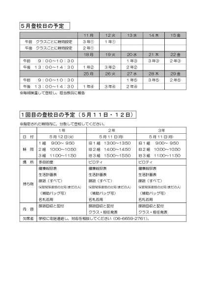 5月11日(月)からの登校日のお知らせです。