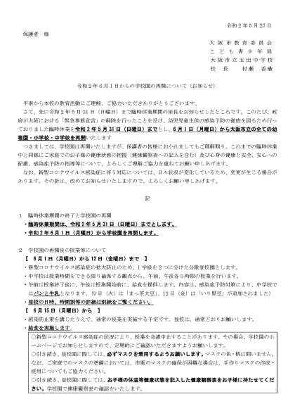 さて、先に令和2年5月31日(日曜日)まで臨時休業期間の延長をお知らせしたところです。このたび、政府が大阪における「緊急事態宣言」の解除を行ったことを受け、幼児児童生徒の感染予防の徹底を図るため行っておりました臨時休業を令和2年5月31日(日曜日)までとし、6月1日(月曜日)から大阪市立の全ての幼稚園・小学校・中学校を再開いたします