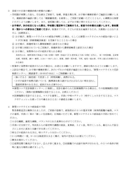 つきましては、学校園は再開いたしますが、保護者の皆様におかれましてもご理解賜り、これまでの臨時休業中と同様にご家庭でのお子様の健康状態の把握(健康観察表への記入を含む)及び心身の健康と安全、安心への配慮、感染症予防の指導等について、よろしくご理解ご協力を重ねてお願い申しあげます。