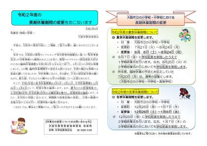 そこで、令和2年度の夏季休業期間を8月8日〜8月24日、冬季休業期間を12月26日〜1月6日として、授業日数を確保します。