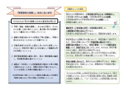 2.最終学年(小学校第6学年・中学校第3学年)は、土曜授業を年間5回以上行うなど、今年度中に学習内容を修了できるよう、授業時数を確保します。