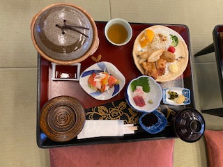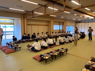 入館式にて、本日お世話になる下電ホテルの皆様に挨拶をして、その後、用意してくださっていた夕食をいただいています。