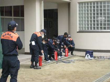 グラウンドで水消火器訓練と