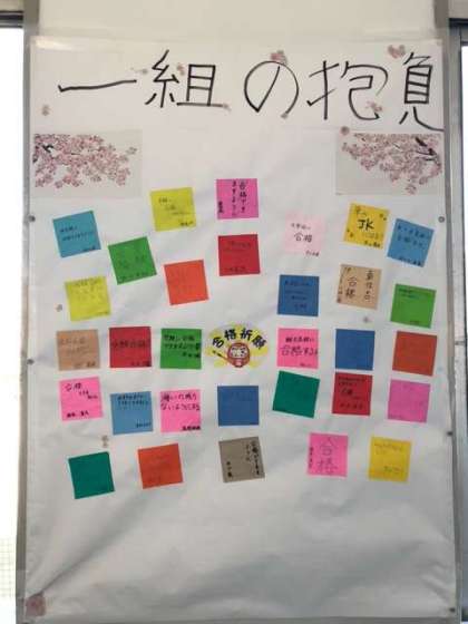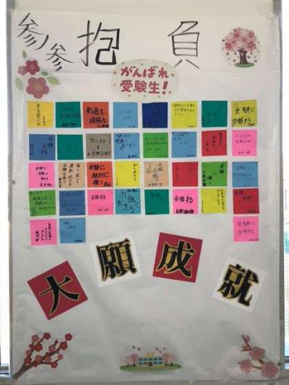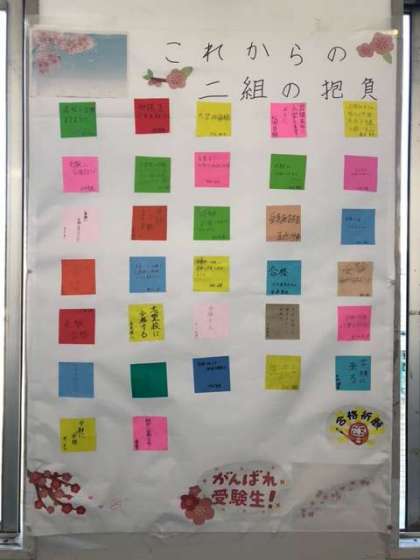 いよいよ明日から私立高校入試が始まります。入試に向けて3年生では、それぞれの抱負を書いて、クラスごとにまとめたものを学年廊下に掲示しています。